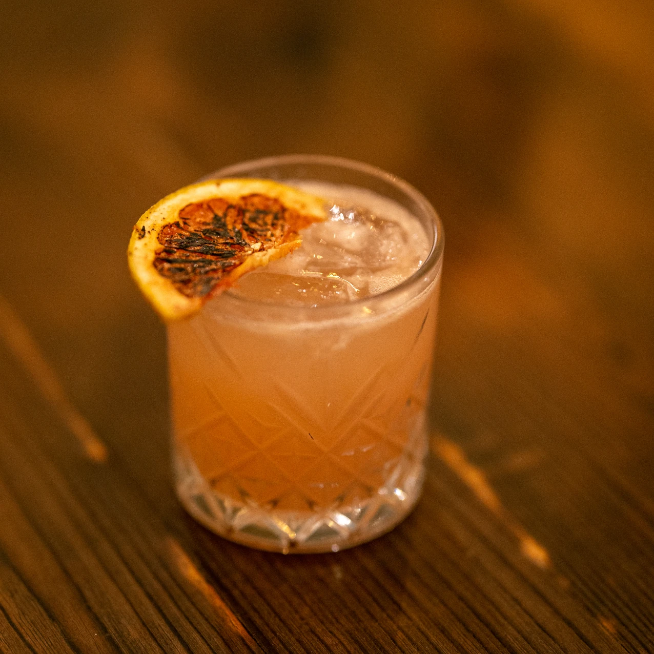 Place all the ingredients in a shaker with ice, shake until well combined, and pour into a glass with ice. Garnish with a slice of dehydrated grapefruit and flame.